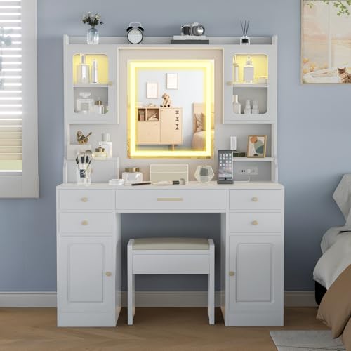 Get ready to transform your bedroom with the Palimder Vanity Desk! This white dressing table is a dream come true for makeup lovers. It features a large mirror with 12 bright LED lights. You can change the brightness and color to get the perfect lighting for your makeup. The desk also offers tons of storage space for all your beauty products. It has a big drawer, shelves, and cabinets. This vanity is easy to put together and looks great in any room.