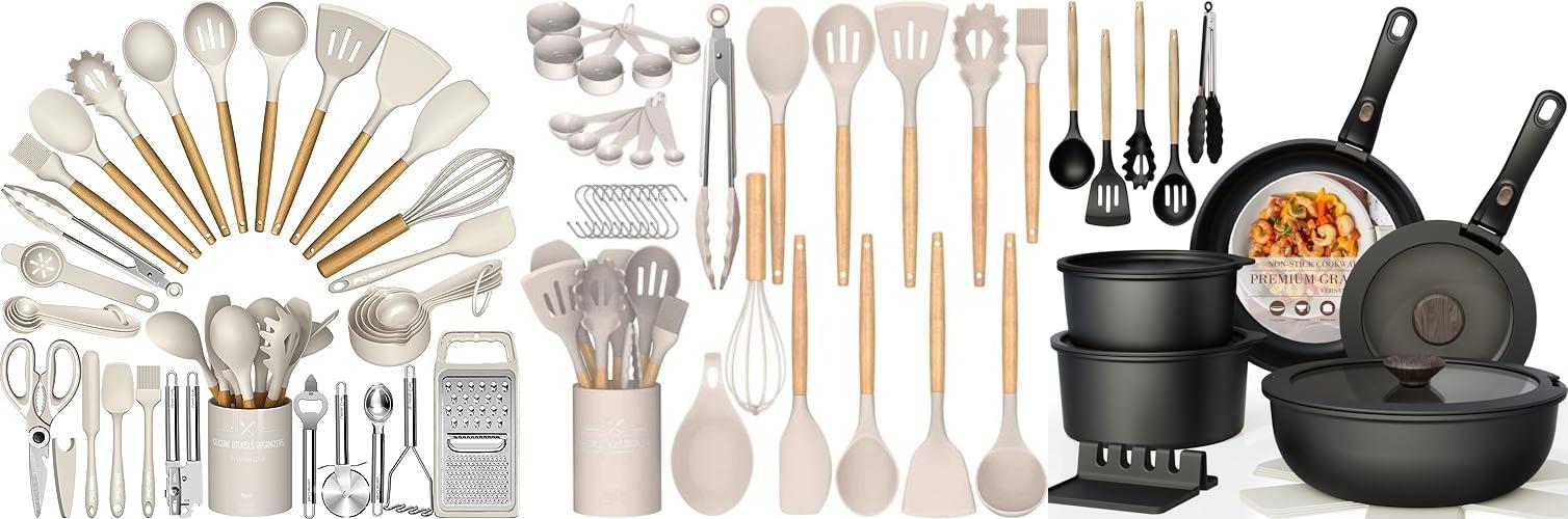 - It’s a complete set, offering a knife set, silicone cooking tools, a cutting board, and other kitchen gadgets.