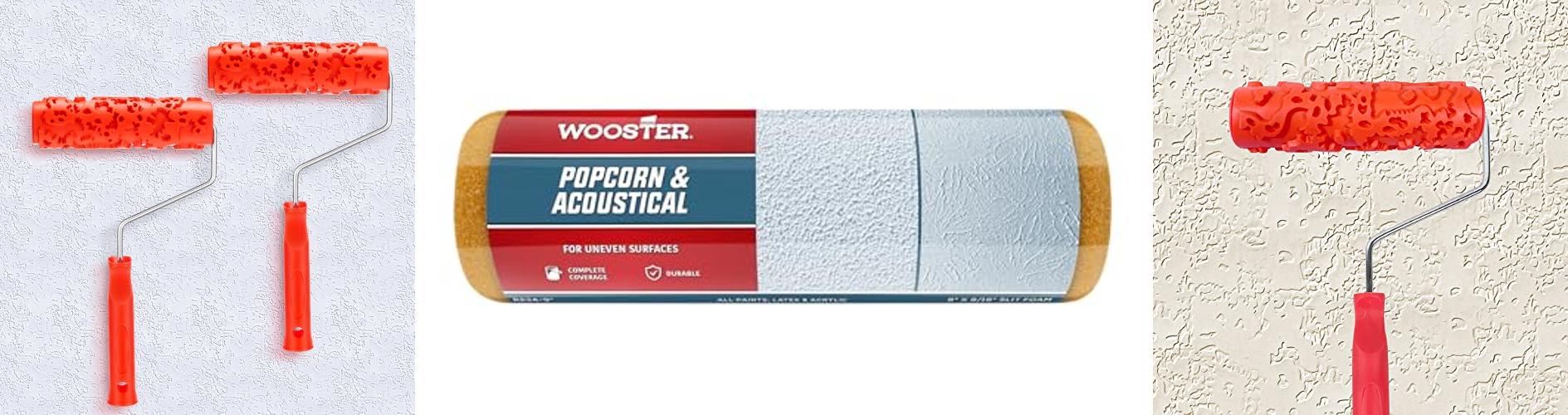 The Wooster Brush R234-9 Popcorn Acoustical Roller Cover is a special roller. It is designed for painting rough surfaces. This roller is great for popcorn ceilings, textured walls, and stucco. The roller has a 9/16-inch nap. It is a 9-inch roller.
