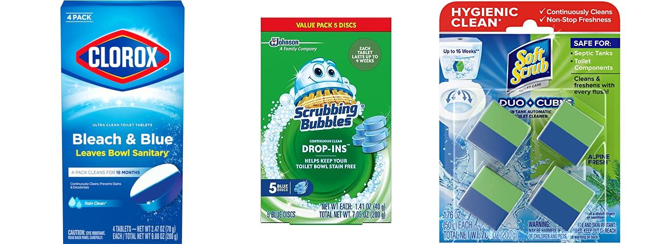 - Tablets: Drop a tablet into your toilet tank. It slowly dissolves and cleans with each flush.