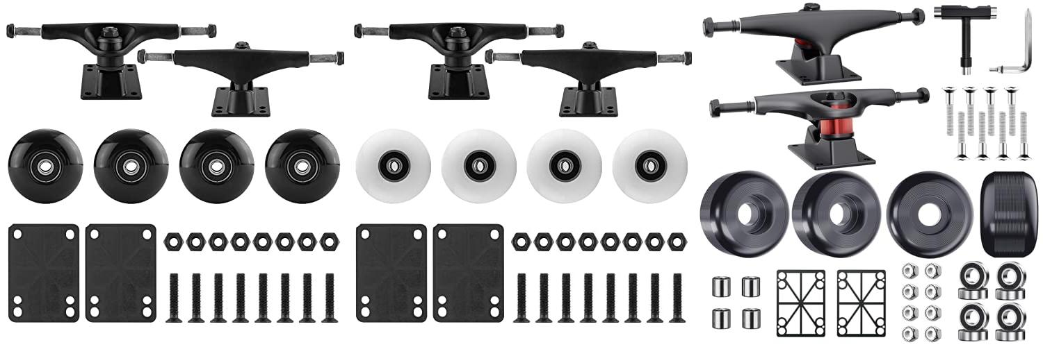 - This set has everything you need to build a skateboard. You get two durable aluminum trucks, four 52mm wheels, ABEC-9 bearings for smooth rides, a T-tool for adjustments, riser pads, and hardware.